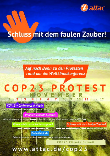 „System change, not climate change!“ ist daher das dringende Gebot der Stunde. Von der Wirtschaft ausgehebelt – auf dem Pariser Abkommen wurde etwa über die Umweltverpestung durch Schiffe und Flugzeuge gar nicht gesprochen – und von Trump verleugnet, fordern wir den dringend notwendigen Wandel ein! Es wird viele verschiedene Protest-Plattformen dazu geben.